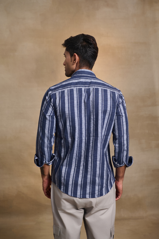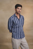 Light Stripe Linen Blend Chines Collar Full Sleeves Shirt - Blue