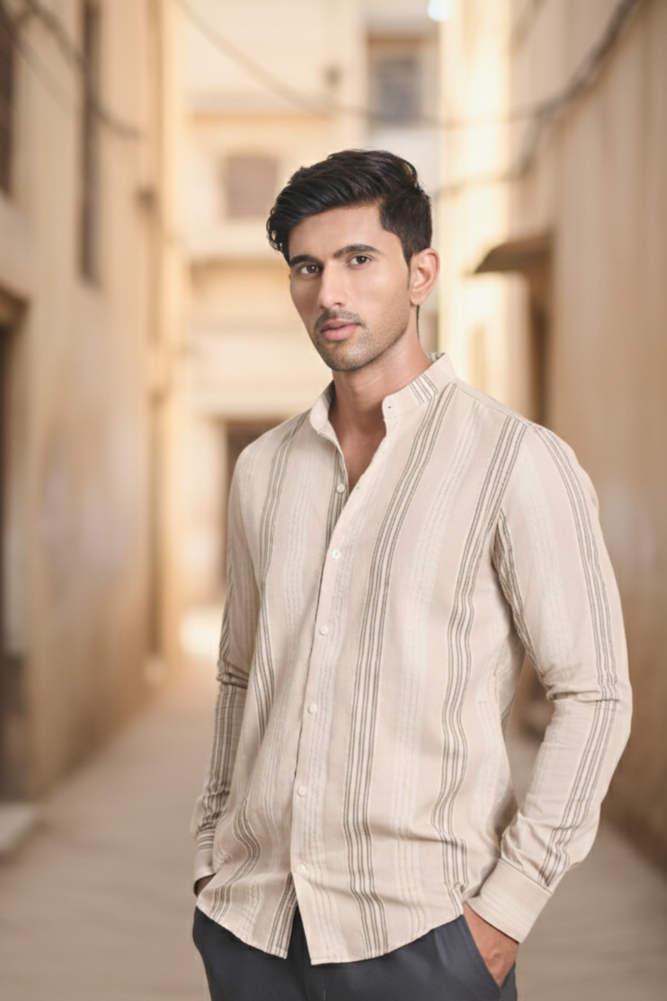 Stand Collar Beige Shirt Made of Fine quality Imported Fabric, the trendy colors beige and off white are sure to make you stand out.