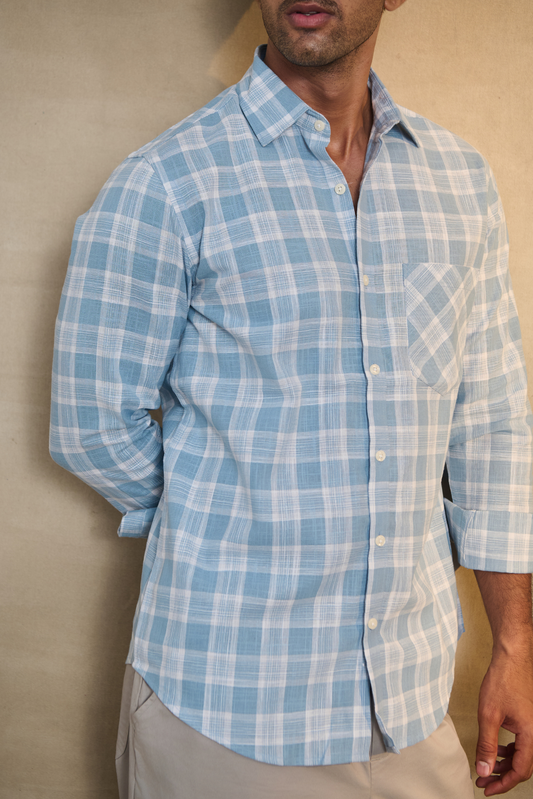 Light Check Linen Blend Chines Collar Full Sleeves Shirt - Blue