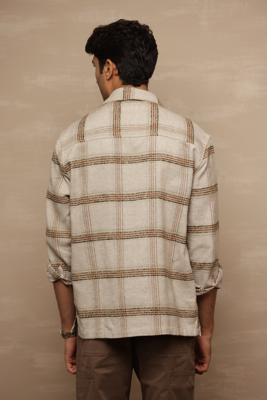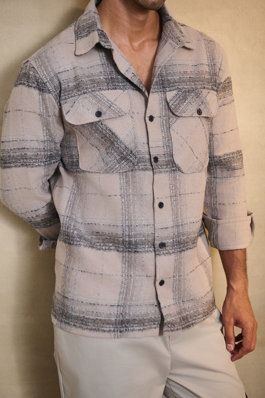 Cotton Linen Blend Check Shirt - Light Beige
