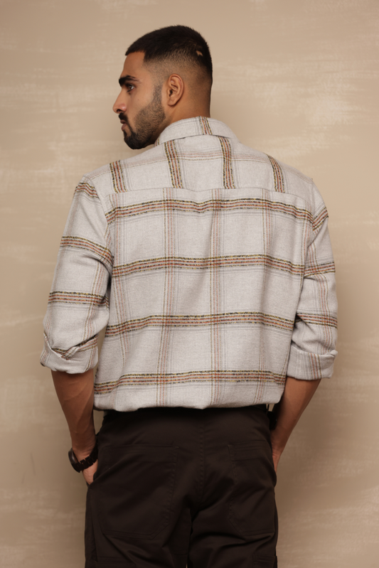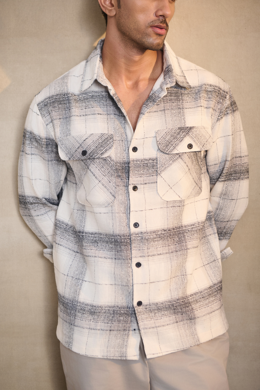 Brushed Check Oversize Shirt with Flapped Double Pocket - Off White