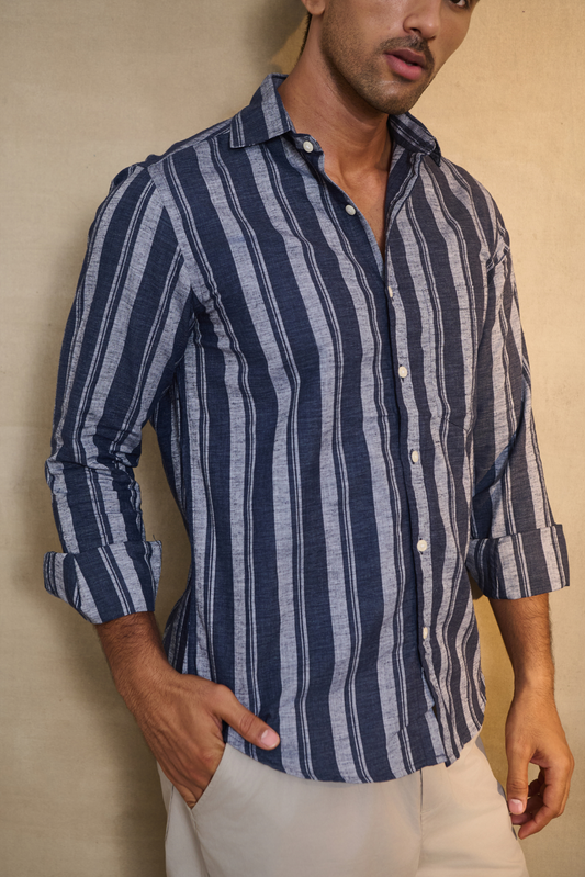 Classic Striped Shirt with Patch Pocket - Blue